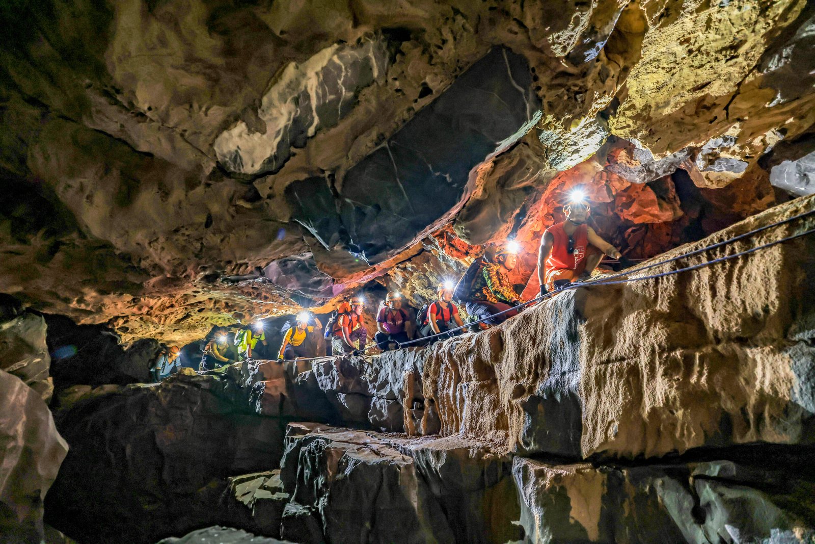 14:30 – 16:00: Khám phá hang Pygmy. Bạn sẽ men theo một sợi dây an toàn dài 80m theo các vách đá giữa vực sâu để  khám phá hang Pygmy. Đoạn sống lưng khủng long sẽ là một thử thách khi bạn phải đu dây xuống một vách đá cao 10m.